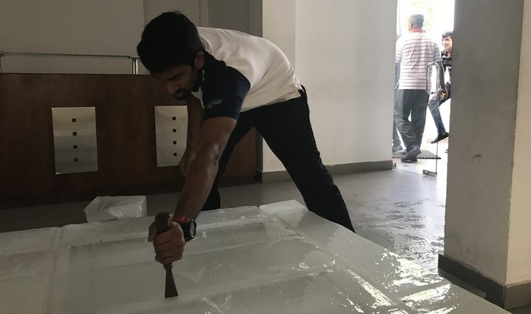 At the heart of the political crisis, amid a protracted struggle for power, was the battle over the dissolution of parliament. Sri Lankan Parliament literally became a battlefield with violence erupting in the chambers on several occasions over the dissolution of parliament. In keeping with this high level drama the artists constructed a rather more mournful and elegant dissolution, by commissioning a team of buffet ice sculptors to create a 6ft x 6ft ice sculpture of the Sri Lankan parliament and letting it dissolve into a puddle before the eyes of the Sri Lankan public.